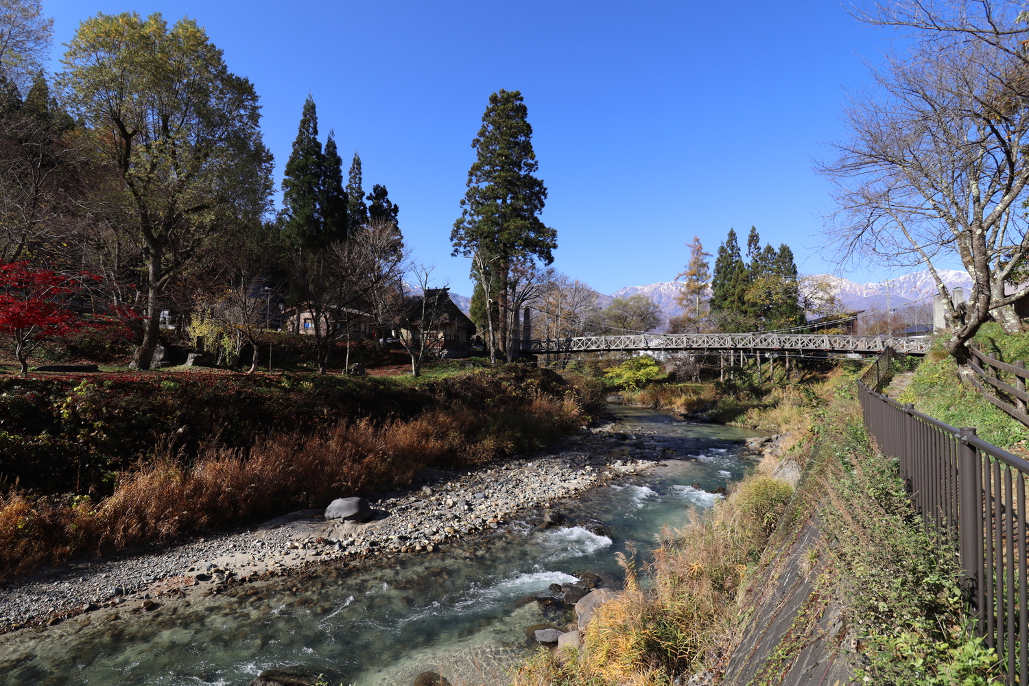 紅葉した木々と、雪化粧をした北アルプスの山々のコラボもとてもすてきでした。