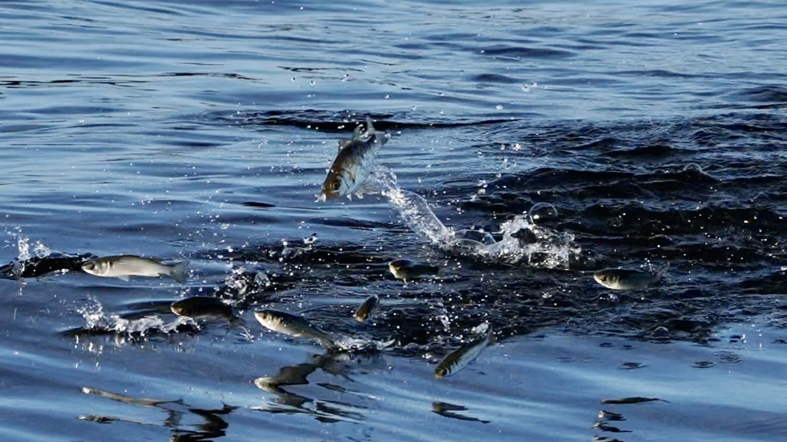 ナブラが進行すると、やがてボイルへと変わります。これは、水面下で追い詰められた小魚が、水面を破って跳ね上がる現象です。富津岬では、イワシ類を中心としたボイルが多く見られ、朝夕の低い光を受けて、銀色の粒が一斉に弾けるような光景になります。