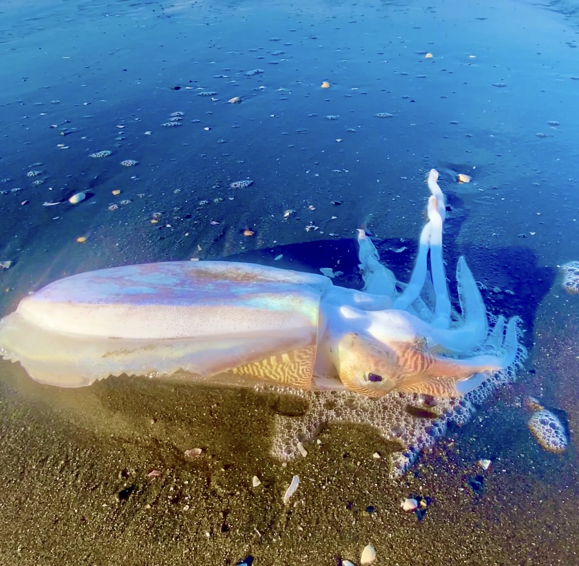 富津岬では、沖だけでなく、波打ち際でも生命の動きを感じられます。ときに、生きたイカや小魚が、逃げるように浅瀬へと追い込まれ、砂浜近くで跳ねる光景に出会います。