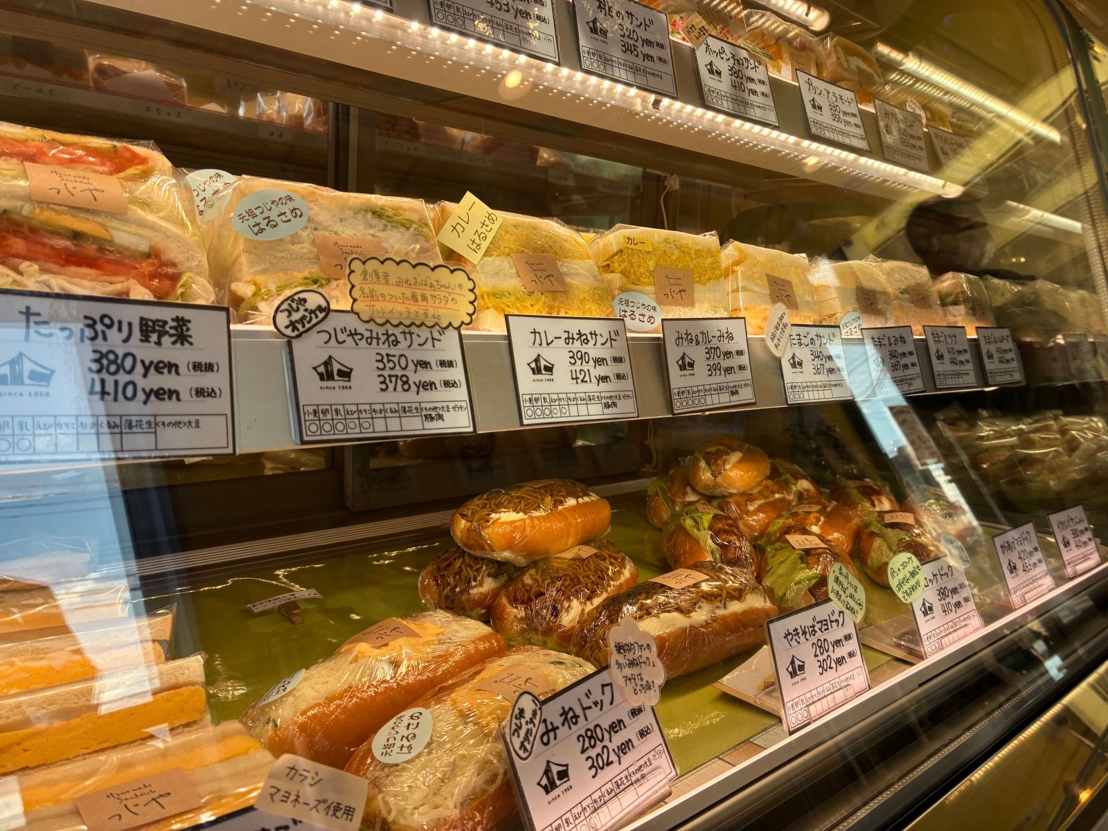 ショーケースの中でたくさんの種類のサンドイッチが飾られてます。