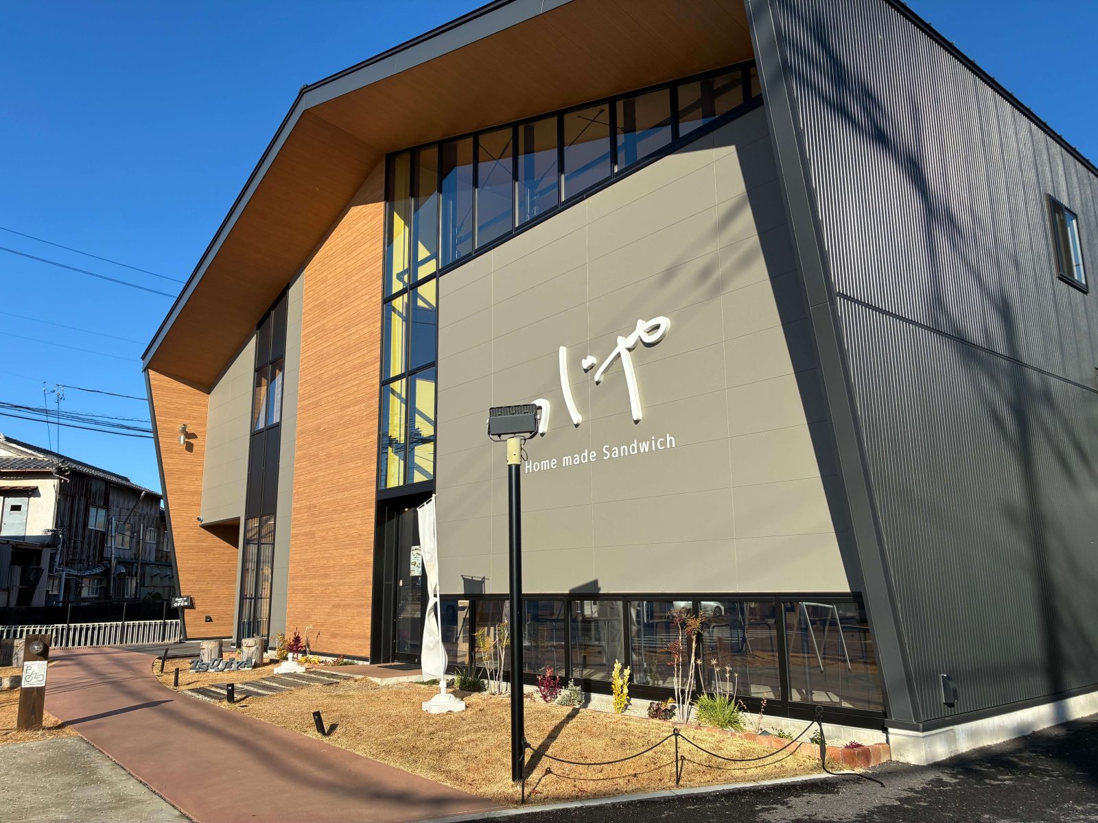 お洒落な外観で目を引くサンドイッチ屋さんのつじや。駐車場もゆっくり停めてお買い物ができる。