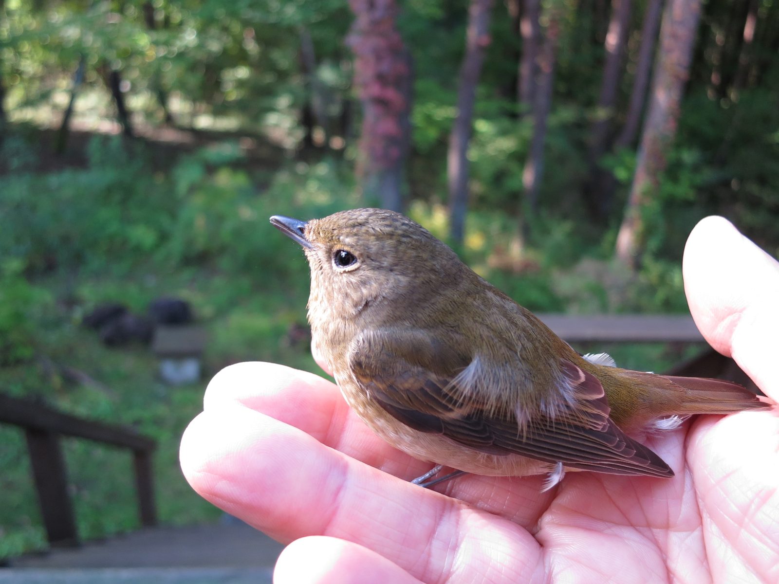 秋になり窓拭きを終え、網戸を外した窓へ激突したキビタキの子。音に気付き拾い上げてみましたが・・・。