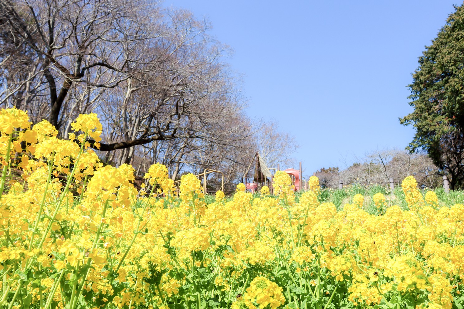 広場の脇には菜の花がたくさん咲いています。