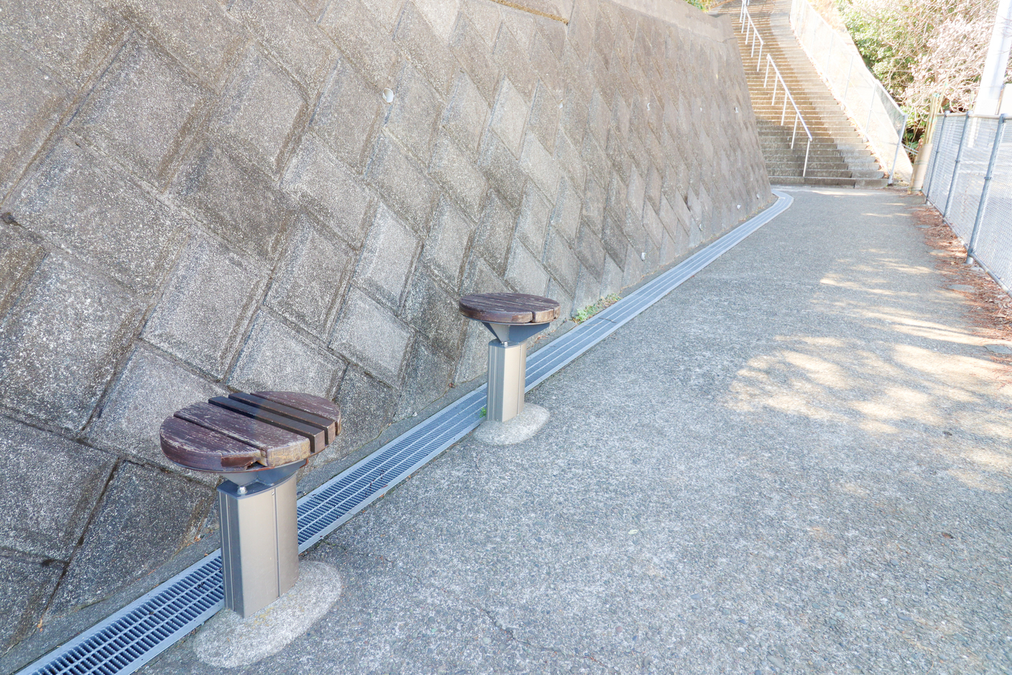 展望台までの石段&坂道にはこのように、ところどころイスが設置されています。
