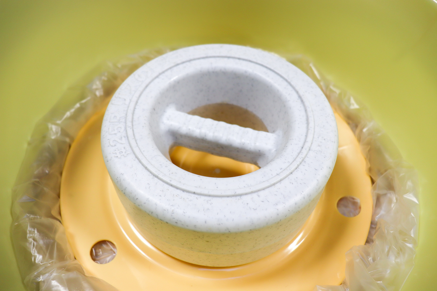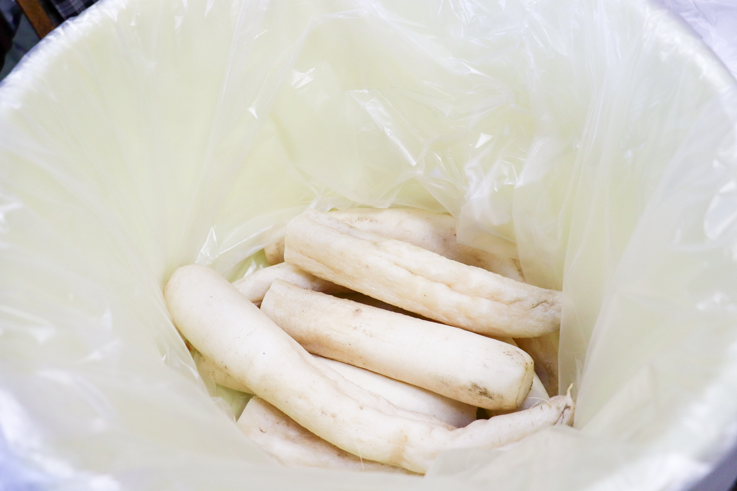 漬物用の樽にビニール袋をかけ、大根をセット。