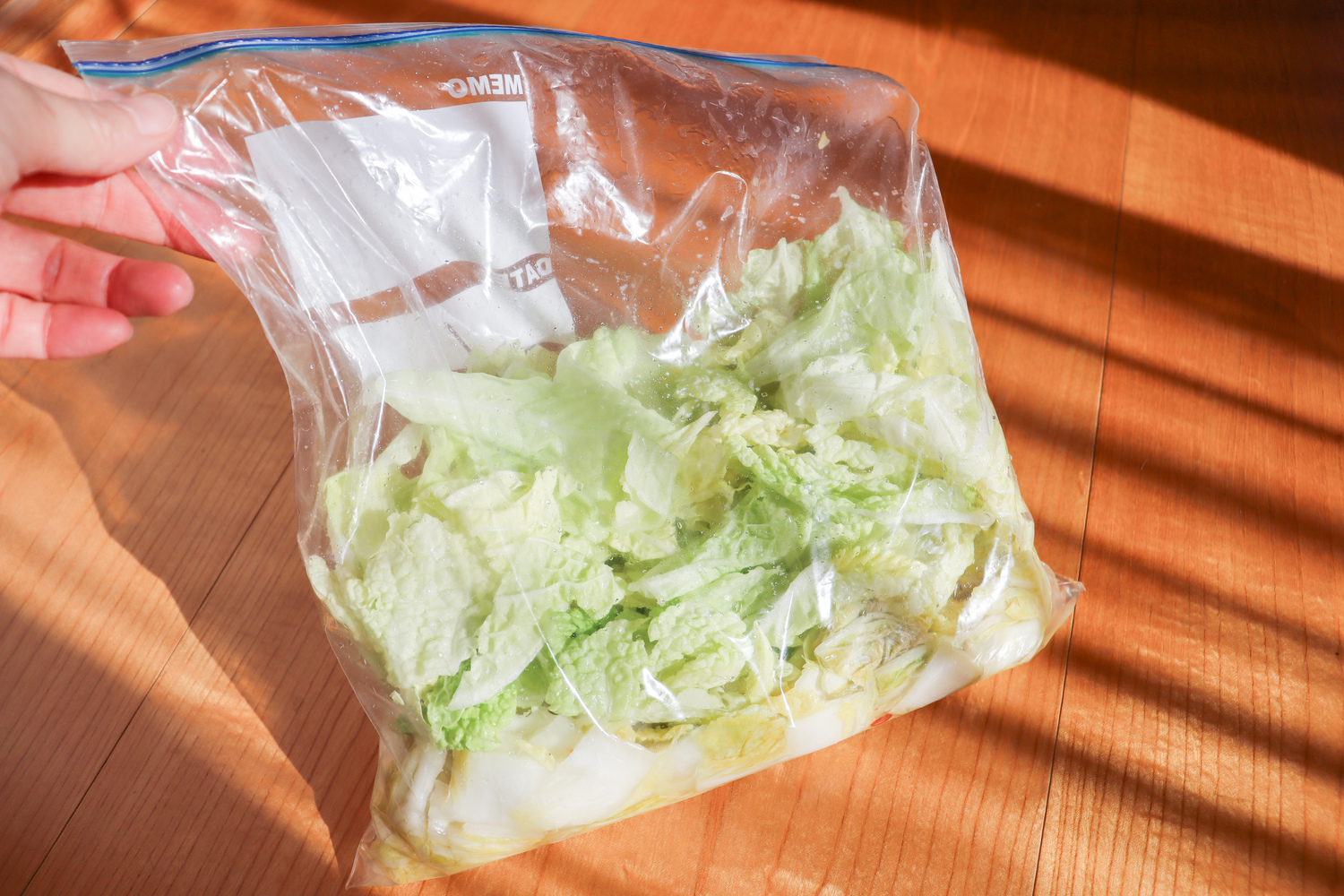 生白菜の浅漬けは、ジップロックに白菜と酢、塩、柚子の果汁を入れて