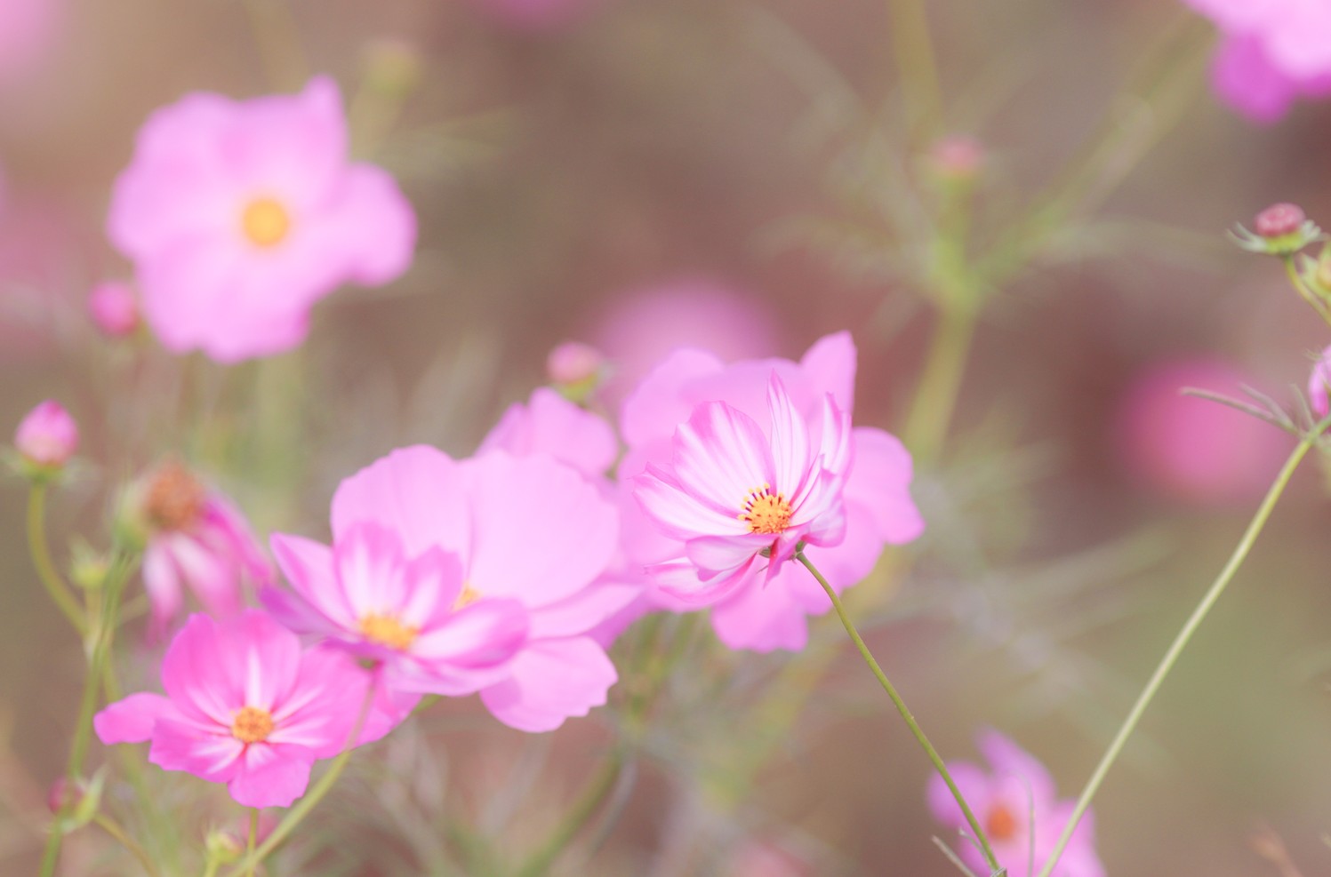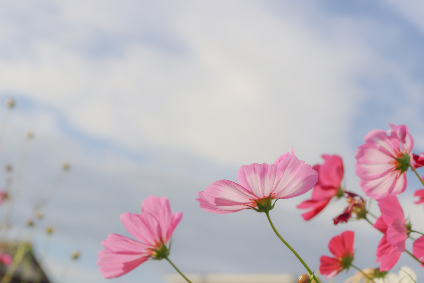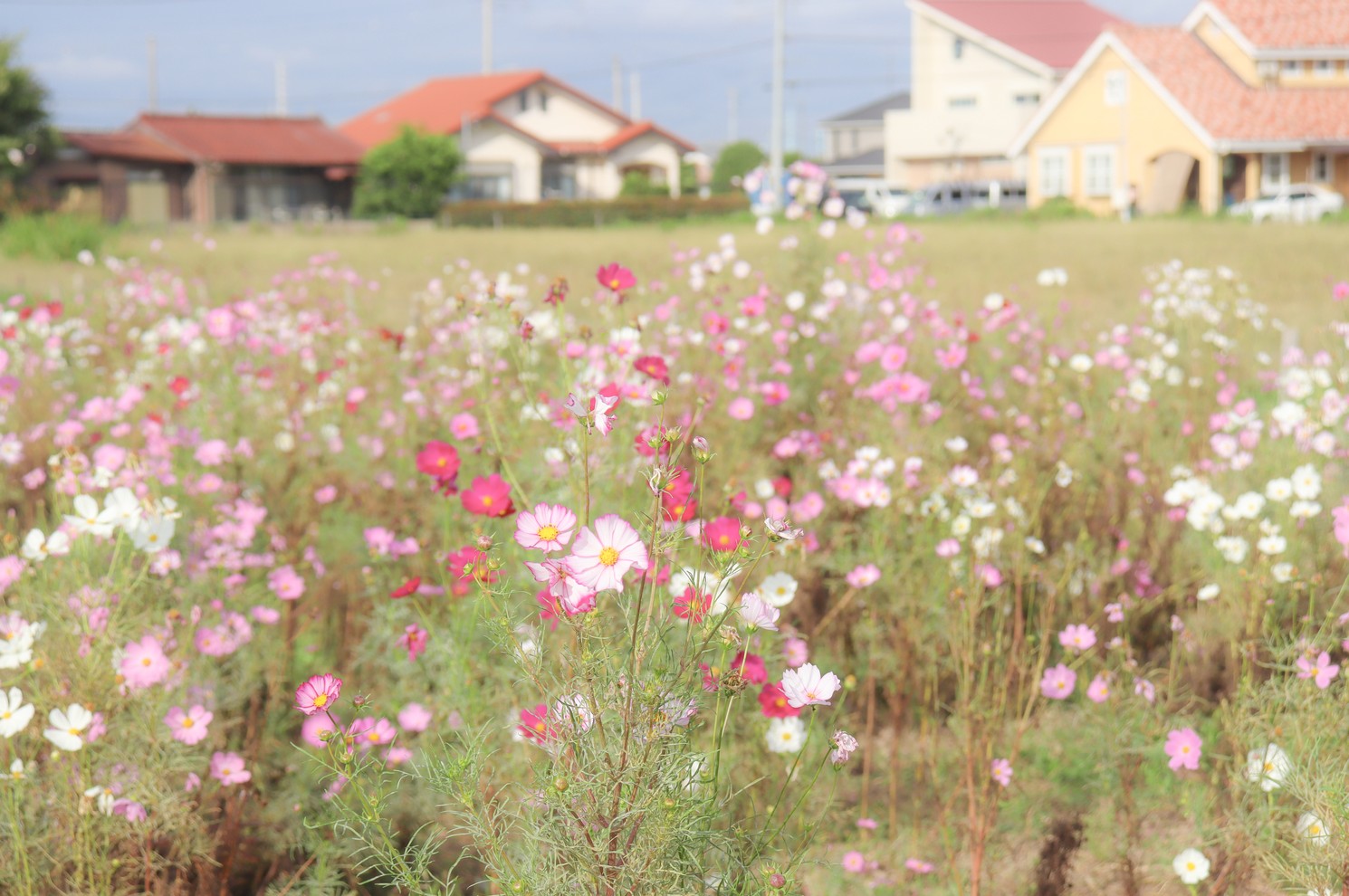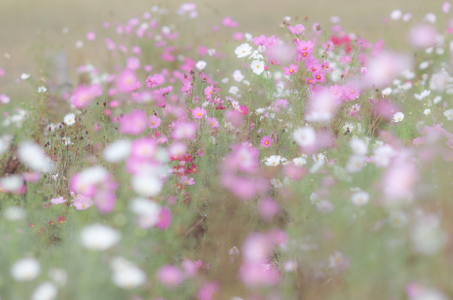 白~淡いピンク色~濃いピンク色のコスモスたちが風に揺れる様子が可愛らしく、