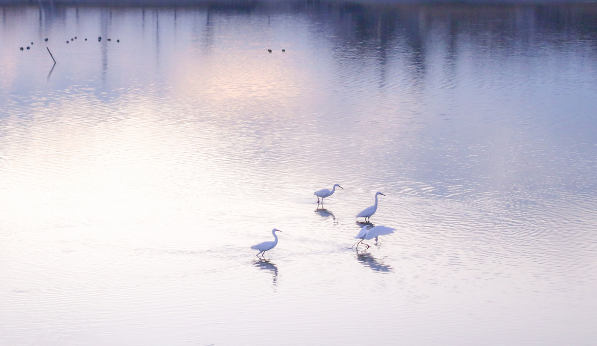 湖の南岸あたりから北岸のあたりへ移動するシロサギたちの姿を見られます。