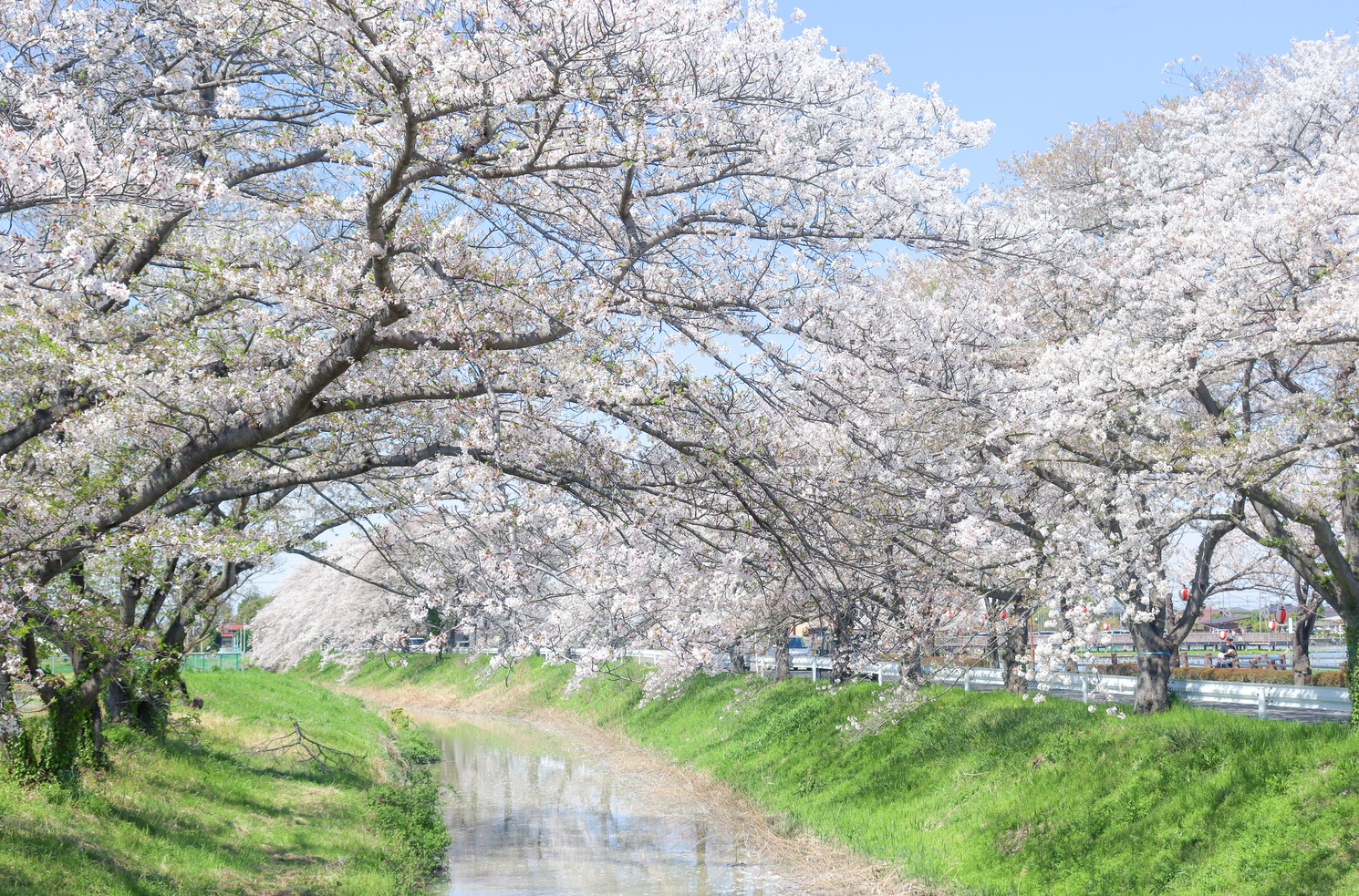 伊佐沼脇を流れる小川の両岸が桜で彩られる他、