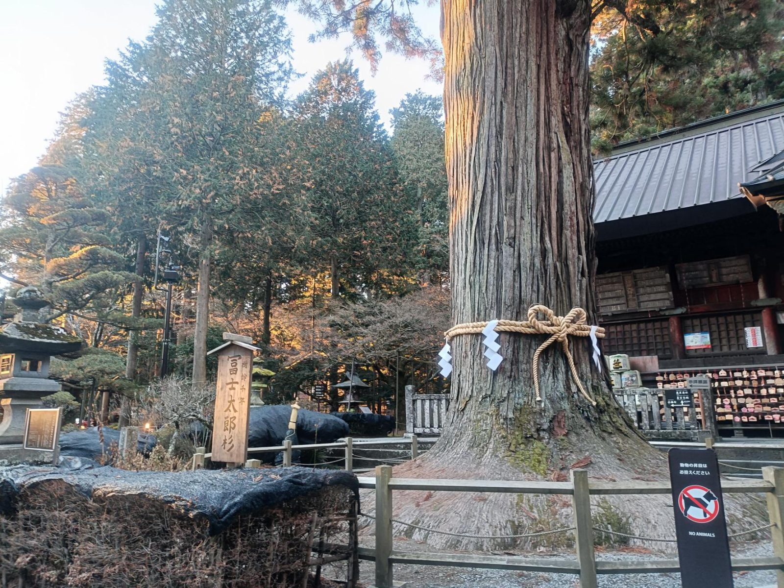 本殿に近づいていくと、左手に存在感のある杉の姿が見えてきました。横の看板には、「樹齢1000年冨士太郎杉」の文字があります。根っこの周りだけでも車一台分ほどもある、まさに冨士太郎の名のとおり大きな杉でした。右側にはこれまた大きな冨士夫婦桧(ヒノキ)がたたずんでいました。二本の巨木が絡みながらそびえ立っている姿は、かなり迫力がありました。