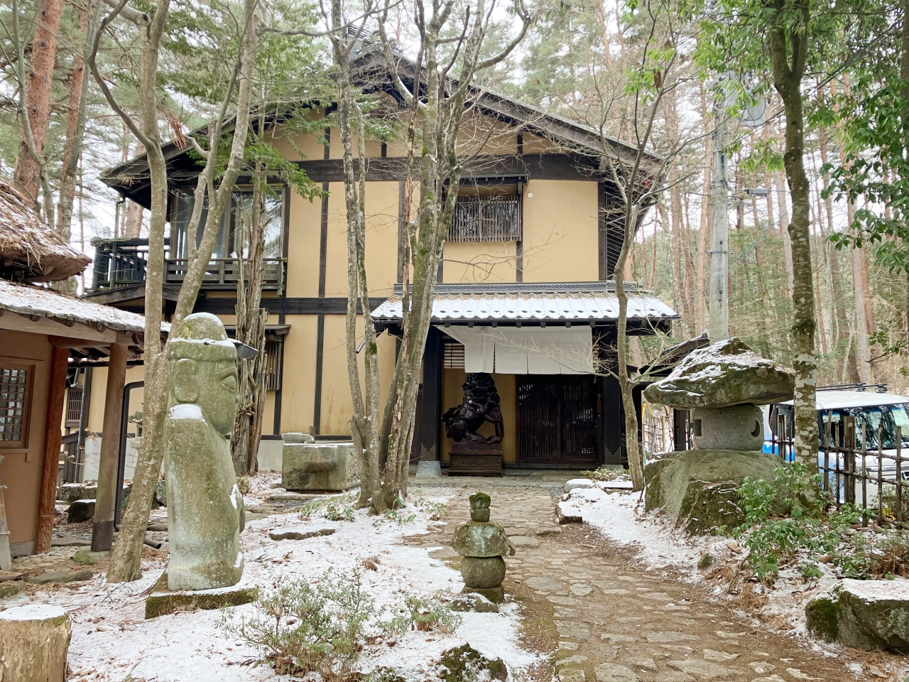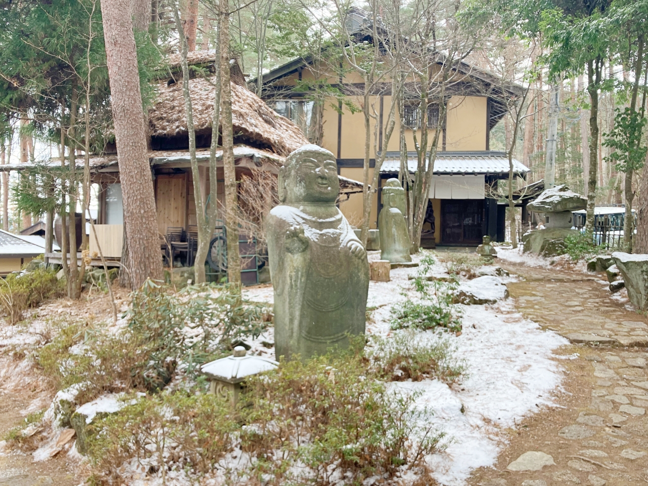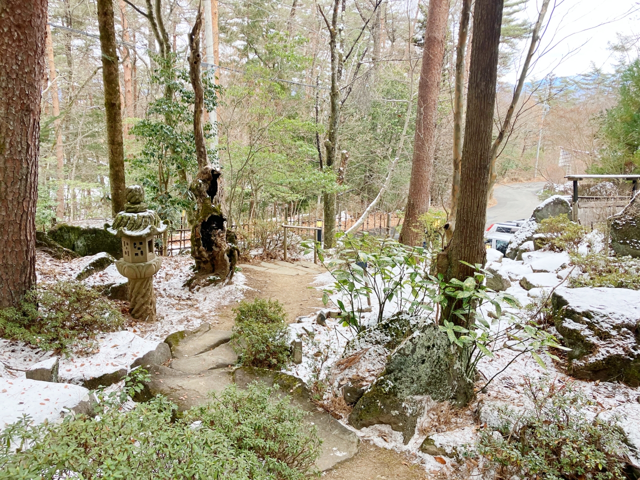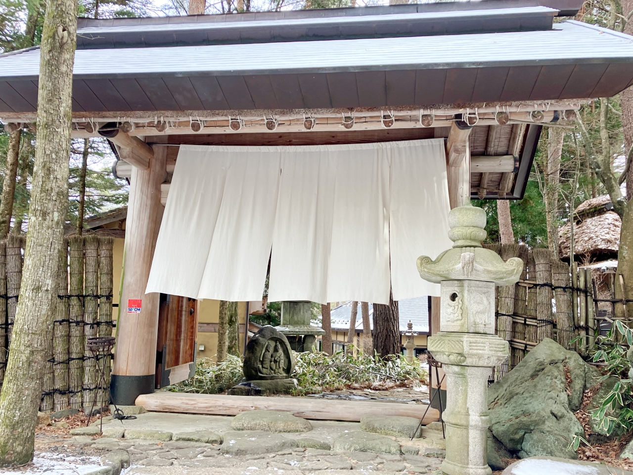 ちなみに、写真の中の右手が一番初めの暖簾がかかった大きな門です。道路沿いをあがってくれば到着できますが、冬は雪が凍っているかもしれないので、駐車場に車を停めた方がいいかもしれません。
