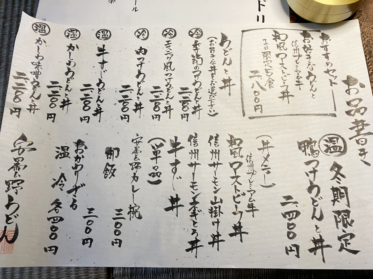 「安曇野うどん」では、うどんと丼ものを注文するようになっています。うどんは、つけ麺と温かいものを用意。季節がら、温かいおうどんに目が行きますよね〜。