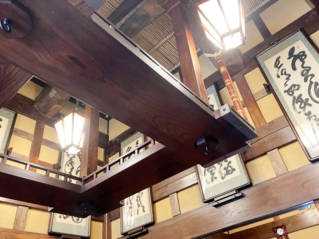 どのお部屋も天井が高く、開放感ある空間を楽しめるようになっています。囲炉裏の部屋の天井にはたくさんの掛け軸が飾られていました。