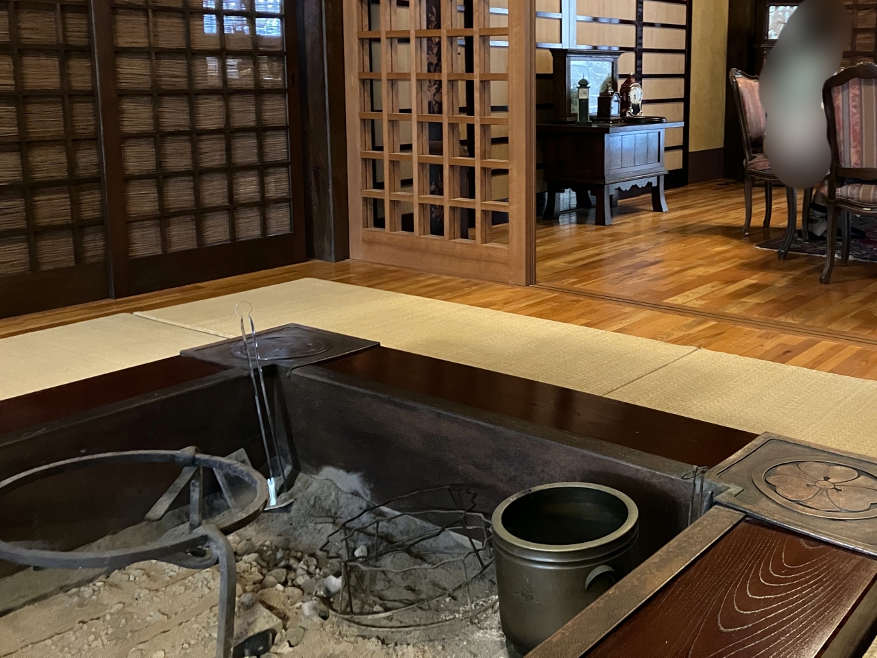 最後の部屋は囲炉裏の部屋です。それぞれ違う雰囲気が楽しめるダイニングルーム。囲炉裏は火が入っていませんが、座布団を敷いて座れるようになっています。