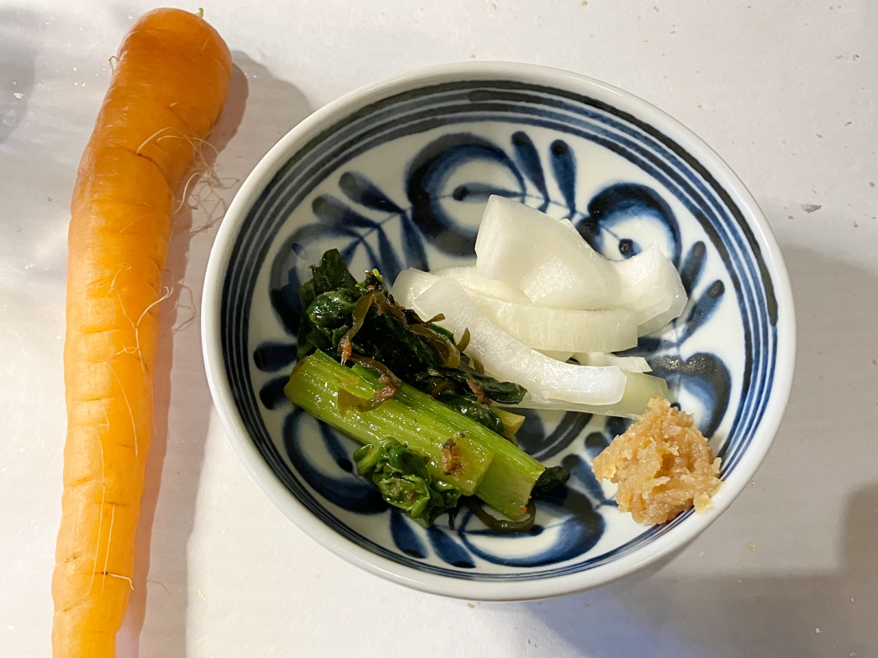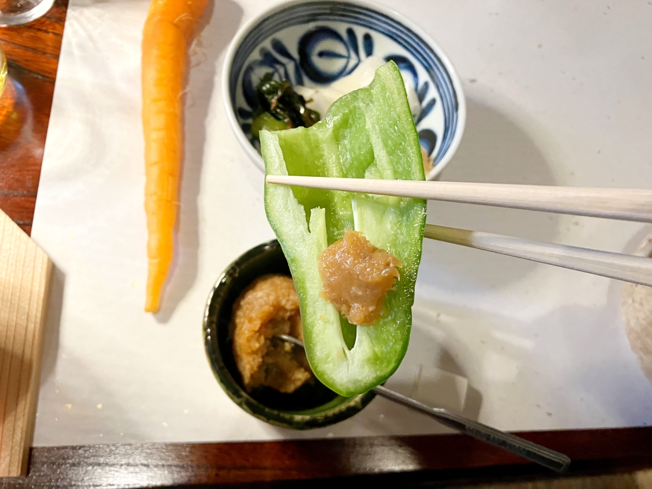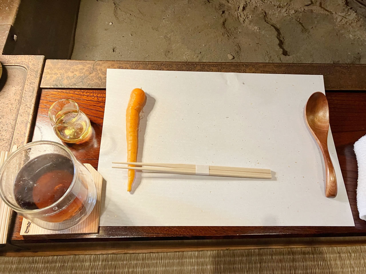 注文を済ませると、テーブルセットを持ってきてくれます。スッと置かれたにんじん……。何かな?と思っていたら、箸が置かれました。