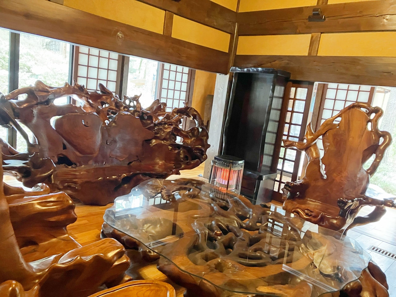 もう一つのお部屋は……。一本の木から作られたのでしょうか。木々をくり抜いた椅子と根っこのテーブル。迫力と力強さを感じる部屋ですね!