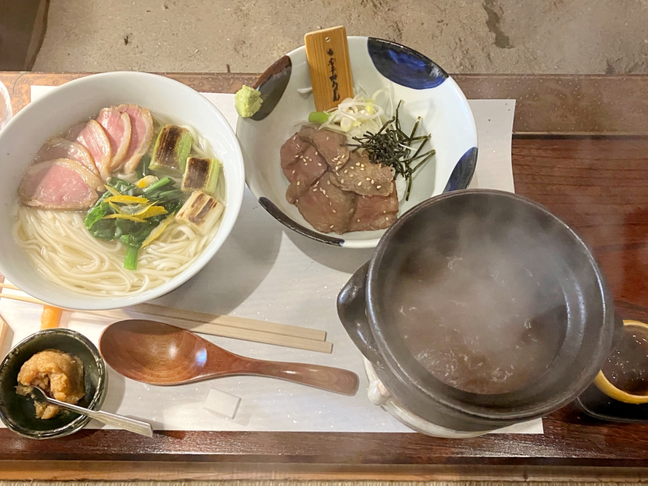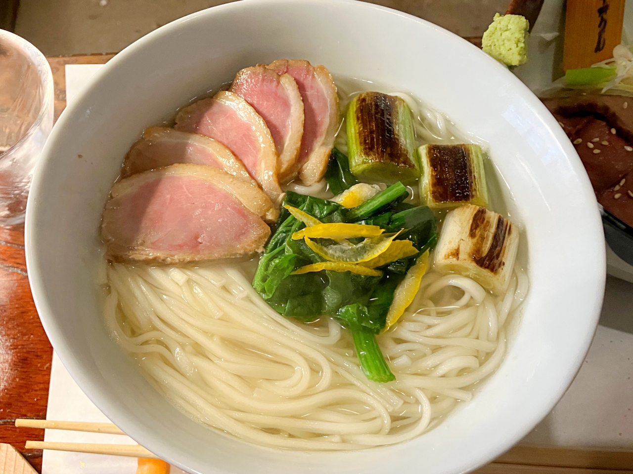 今回注文したのは、鴨つけうどんと和牛ローストビーフです。うどんのつけ汁は、火にかけてくれたので、最後まで熱々でいただけます。
