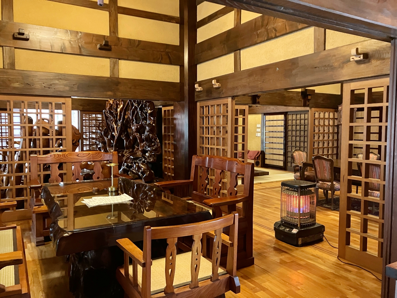 「安曇野うどん」のダイニングルームは、4つに分かれています。それぞれの部屋には、中央に大きなテーブルが設置されています。ストーブも寒くないよう大きなものを置いてくれていますよ。