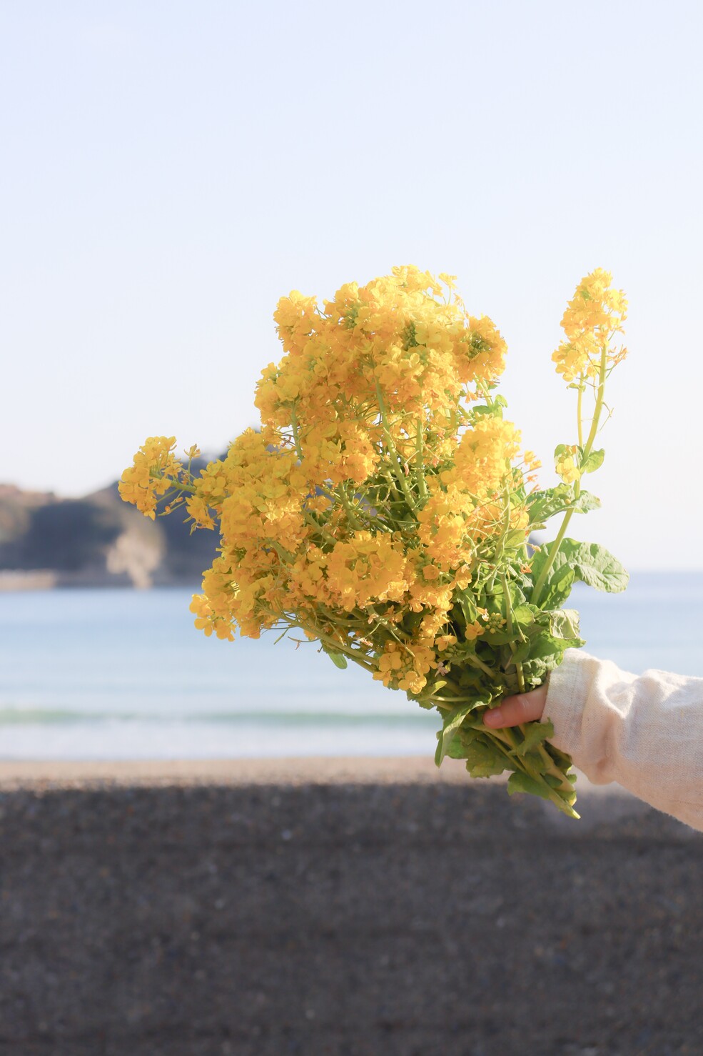 摘み取った菜の花を持って、近くの海に寄り道を。