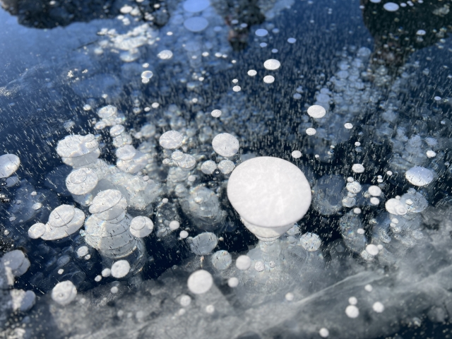 湖底の植物や堆積物から発生したメタンガスが水面に達する前に凍りついて氷の中に留まる現象