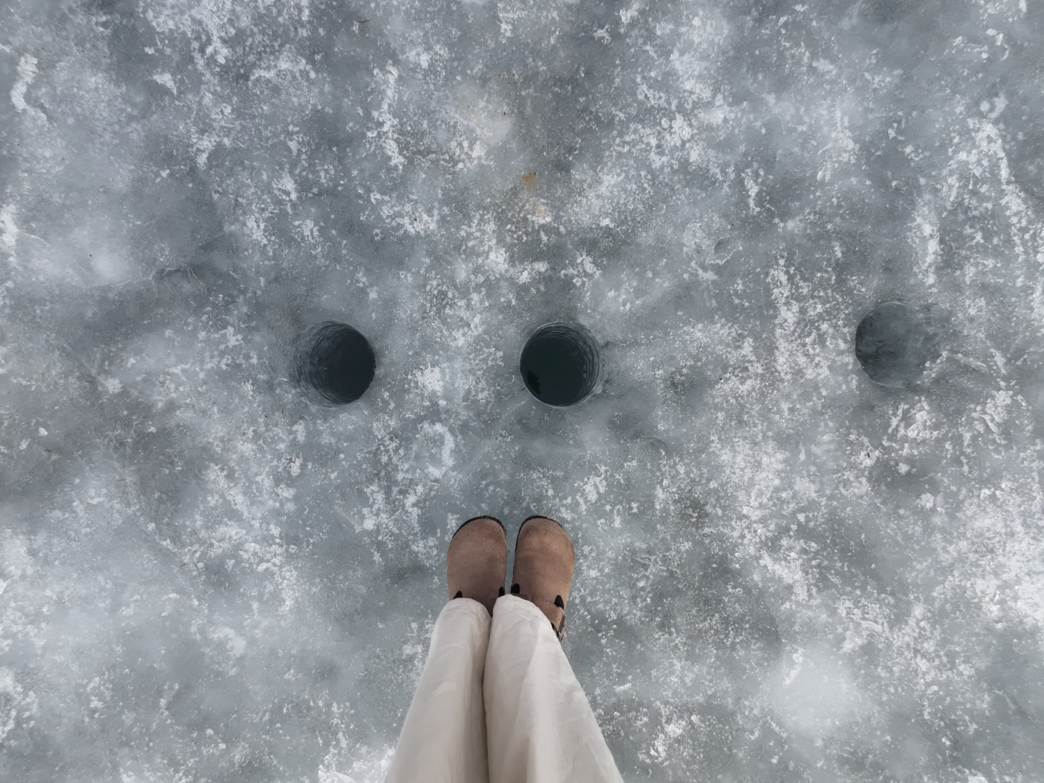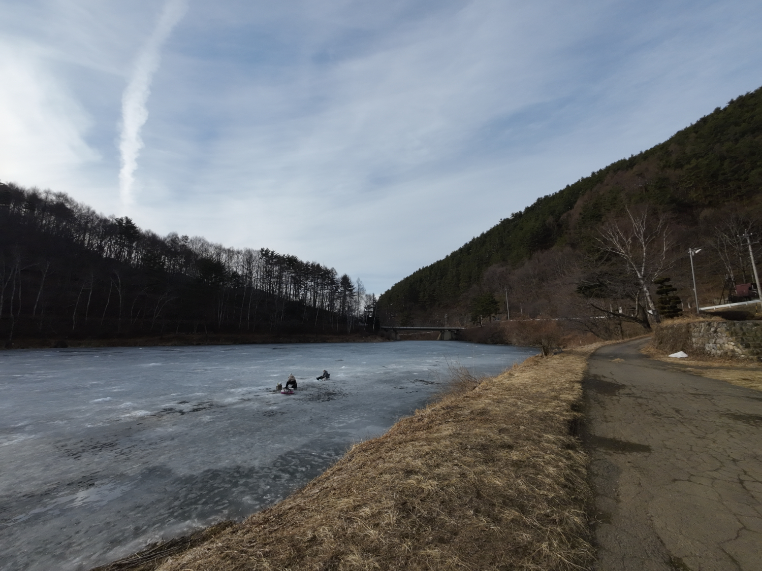 ワカサギ釣りをしている人がいる⋯ということは湖の上に立てる⋯