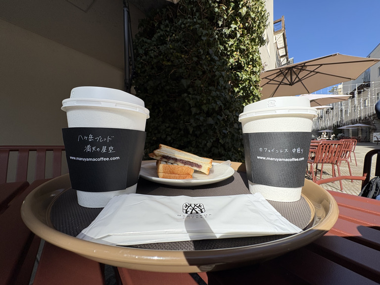 今回は、お目当ての「八ヶ岳ブレンド〜満天の星空〜」と「カフェインレス 中煎り」、「ホットあんバターサンド」を注文。天気が良かったので、外の席でいただくことにしました。
