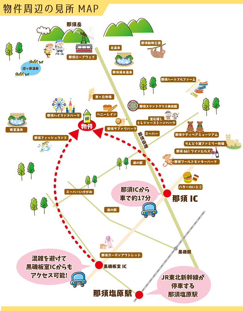 | 【別荘地までのアクセス】 ●JR東北新幹線「那須塩原駅」より車で 約30分(約20km) ●東北自動車道「那須IC」より車で 17分(約11㎞) |