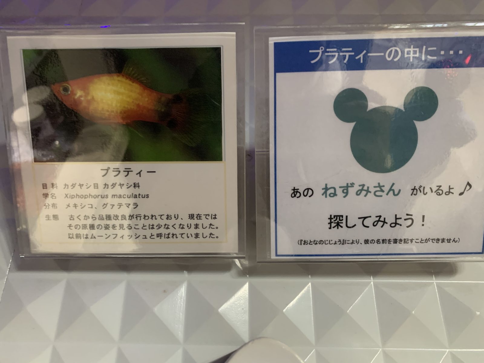ミッキーの模様が特徴のプラティー(旧:ムーンフィッシュ)もいて、子どもは大興奮!ミッキーマークを見つけた時はなんだか嬉しくなっちゃいますね。