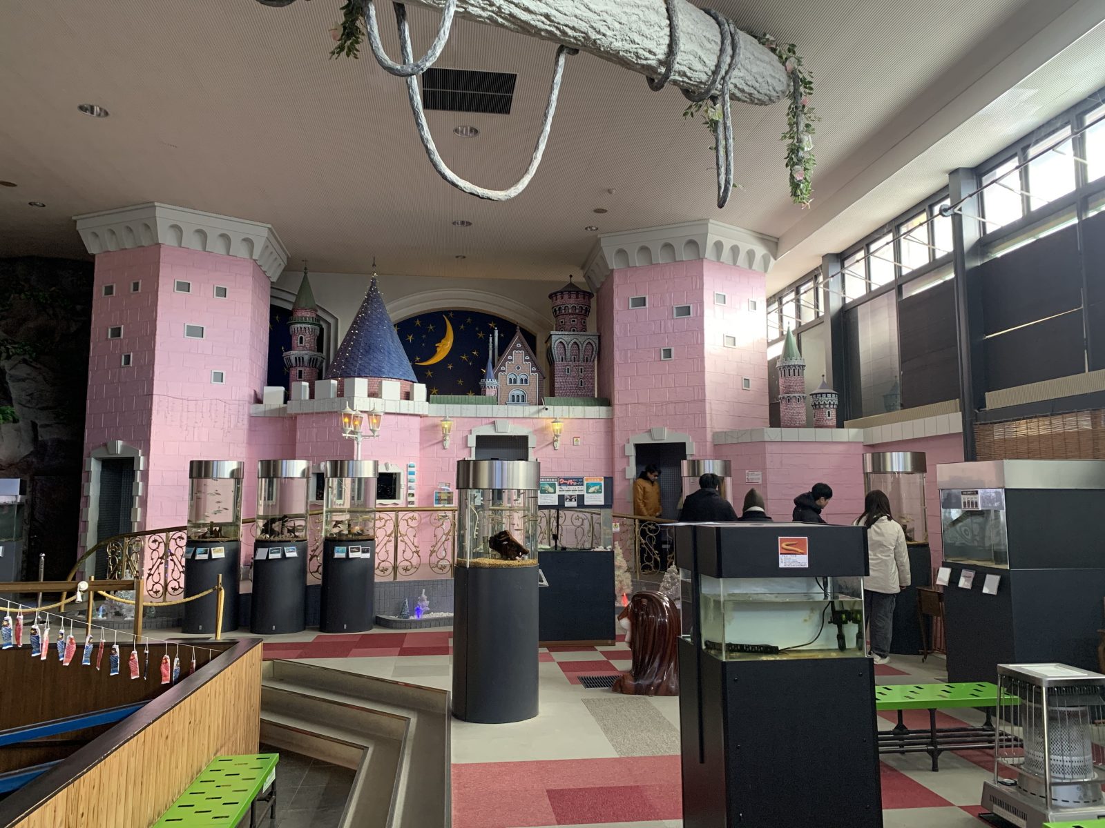 なんだか平成初期の盛り上がりを彷彿とさせられます。おとぎ話の中に入ったような、ピンクのお城やメルヘンチックな木など。外観とのギャップにドキドキ。